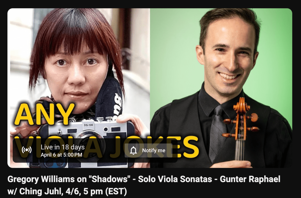 Lastly, the part of today’s blogpost that I am most excited to share… (Drumroll, please!) I am going to be interviewed by my dear friend and colleague Ching Juhl’s podcast, “Any Viola Jokes,” on her YouTube Channel, Juhl Media. It will take place on Friday, April 5th, at 5pm. This would be a great time to come in and ask some questions about the album that you might have!