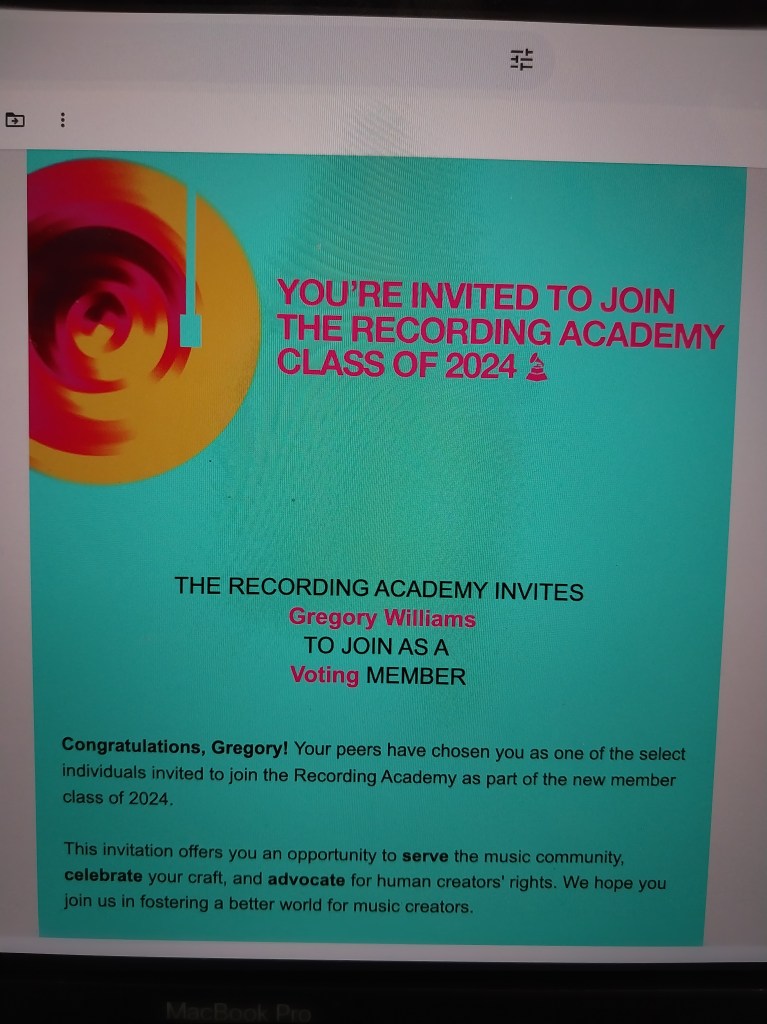 “Congratulations, Gregory! Your peers have chosen you as one of the select individuals invited to join the Recording Academy as part of the new member class of 2024.