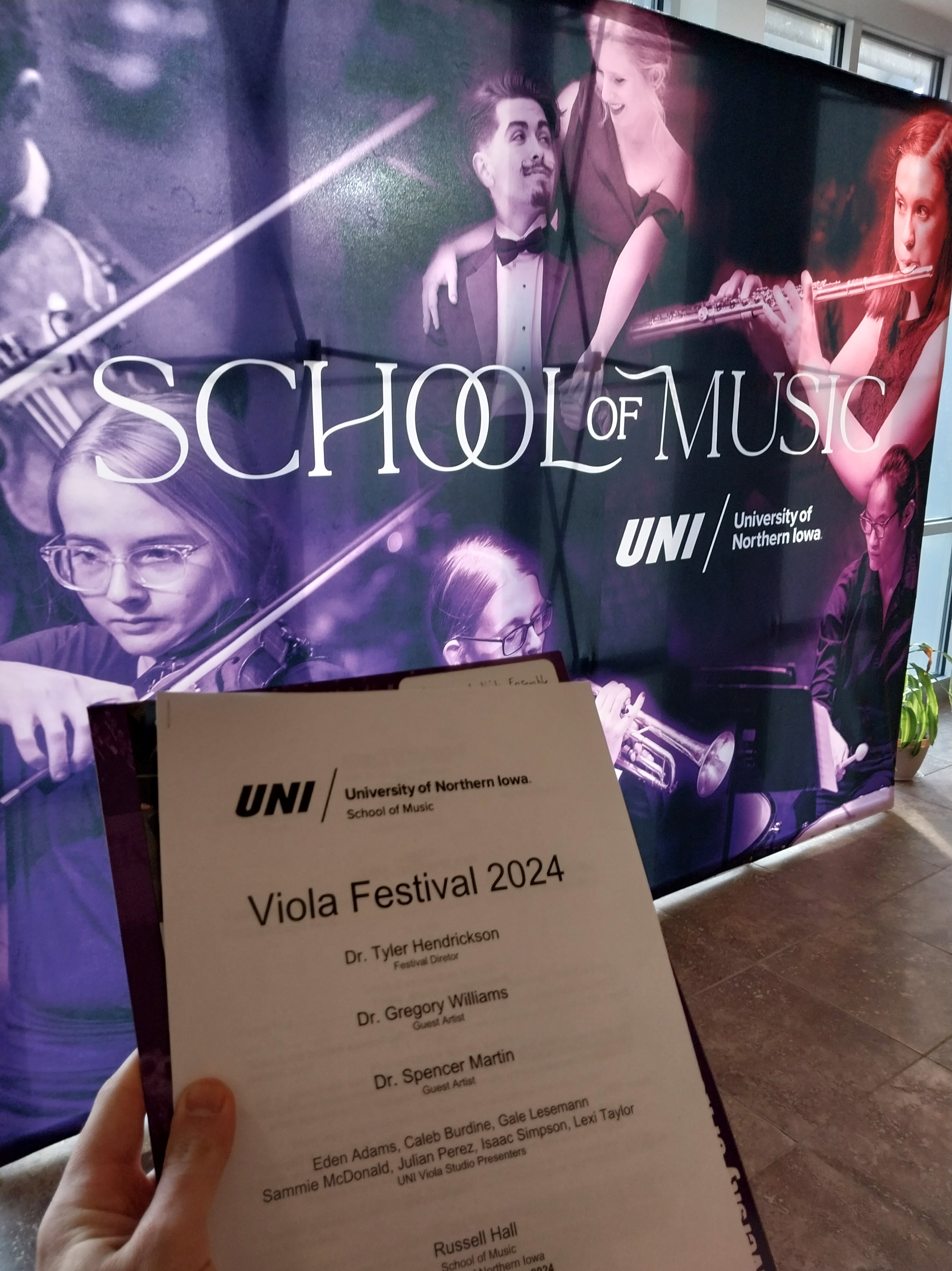 On Saturday, I had the distinct honor of being a Guest Artist at the UNI Viola Festival, a day-long exploration and celebration of all things viola! The day from start to finish was a ton of fun! I got to work with the senior viola ensemble, a group of about a dozen students (which included some talented Middle Schoolers, High Schoolers, and UNI students to assist), playing one of Bèla Bartok’s duos (the Ruthenian Folk Song), a four-part arrangement of the Trèpak from the Nutcracker Suite; and an arrangement of the theme from the second movement of Beethoven’s Symphony No. 7! I also had the honor of giving a masterclass to one of the UNI violists who is giving his senior recital in a few weeks. He performed the third movement of Schumann’s Märchenbilder, which is admittedly one of the more daunting movements. The afternoon culminated with a concert that included both Viola Ensembles– (the Junior Ensemble was conducted by Dr. Spencer Martin, who is the viola professor at Luther College); I gave an encore performance of Lev “Ljova” Zhurbin’s Cynhops, a jazzy and rollicking piece, and Spencer performed two works by Lillian Fuchs. The performance culminated with J. S. Bach’s Brandenburg Concerto No. 6, helping to fulfill a bucket list goal of performing this masterpiece live. It was wonderful getting to perform the Viola 1 part (and collaborating with Tyler on the second part), and getting to collaborate with Spencer and Kathi Angeroth playing the Viola da Gamba parts on viola; Alexander Wemmie on cello; and UNI faculty William Yager on bass and Vakhtang Kodanashvilil on piano. As the grand finale, the combined festival viola ensemble performed the Theme for Vitula by Gale Lesemann, a composition major (and viola student) at UNI. (Vitula is the studio mascot, a stuffed panther that doubles as a support animal for the violists in the studio.)