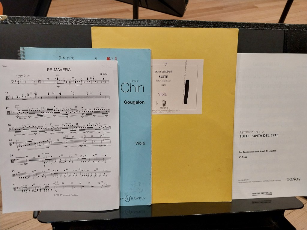 Today marked our first day in rehearsal gearing up for Sunday’s Parlando concert. It was a fun morning as we began putting our program together. The repertoire is centered around Sidewalk Tango music, and as we are starting to put things together, I think I can say that this is one of my favorite programs that we have done so far, and this is one concert that you should definitely try to attend! We are performing Erwin Schulhoff’s Suite for Chamber Orchestra, WV 58, Unsuk Chin’s Gougalon, and Astor Piazzolla’s Suite Punta del Este, with the legendary JP Jofre performing on bandoneon.