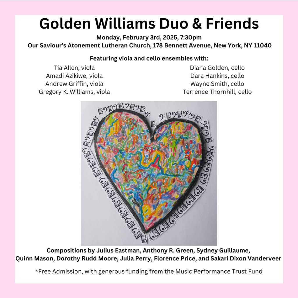 We are thrilled to feature viola and cello ensemble music on Monday, February 3, 2025, at 7:30pm, at Our Saviour’s Atonement Lutheran Church (178 Bennett Avenue, NYC). We will be joined by the fabulous violists Tia Allen, Amadi Azikiwe, and Andrew Griffin, and the marvelous cellists Dara Hankins, Wayne Smith, and Terrence Thornhill, to perform works by Julius Eastman, Anthony R. Green, Sydney Guillaume, Quinn Mason, Dorothy Rudd Moore, Julia Perry, Florence Price, and Sakari Dixon Vanderveer. Please join us for this unique event, where we bask in our love for viola and cello pairings! Free admission, made possible by the Music Performance Trust Fund.