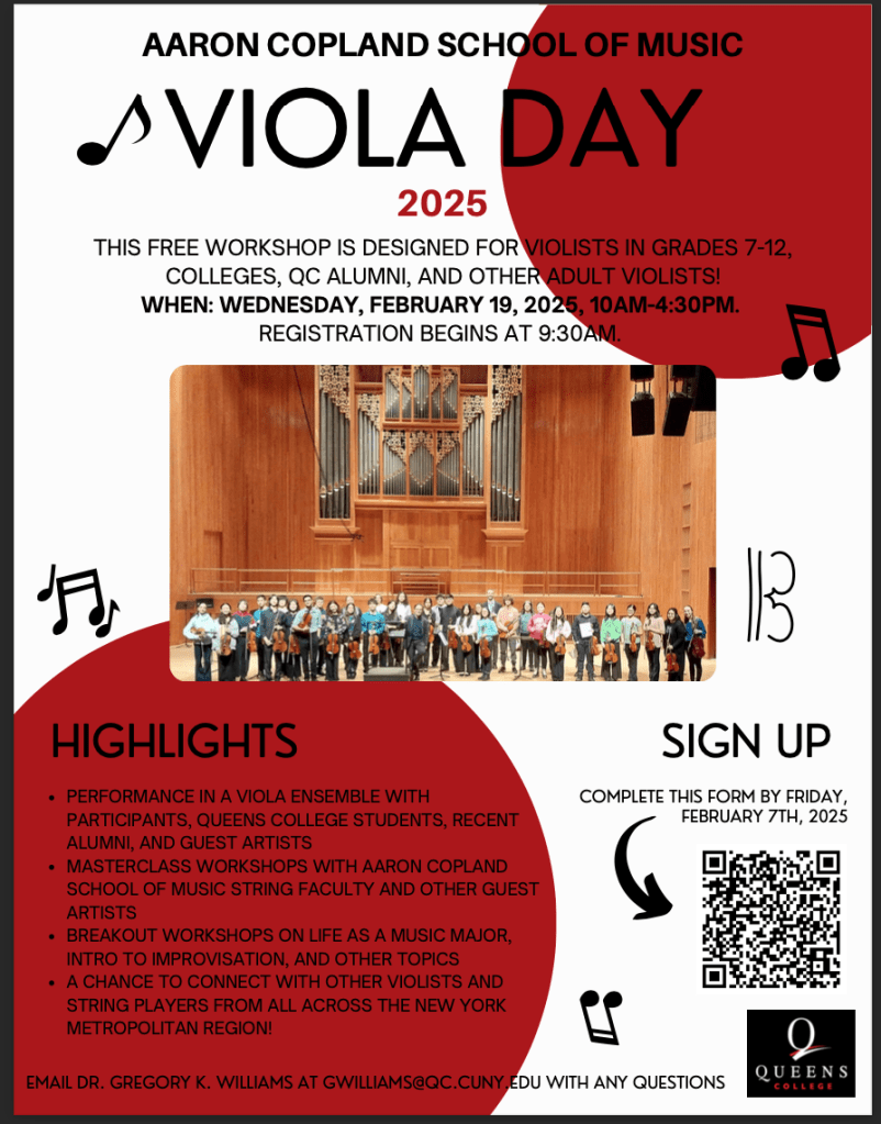 Good morning, everyone! The 4th Annual Aaron Copland School of Music Viola Day will be held on Wednesday, February 19th, 2025 at Queens College! It is open to Middle Schoolers, High Schoolers, College Students, Adult Professionals and Amateurs who love all things viola and want to have the opportunity to share that love of the alto clef with others!
